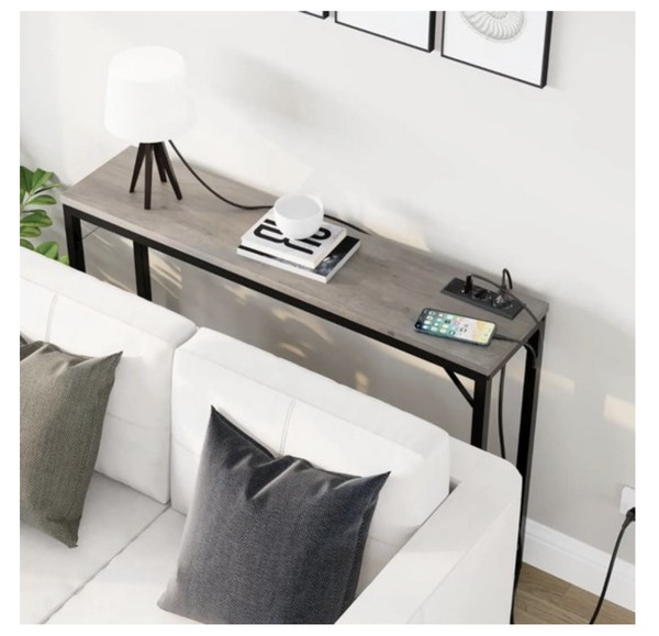 Gangtafel - Muurtafel - Consoletafel - Sidetable - Banktafel - Hout - Stalen poten - Stopcontact - 2x USB-A - Industrieel - Grijs