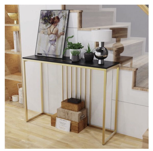 Gangtafel - Muurtafel - Gangtafel - Consoletafel - Sidetable - Banktafel - Gesinterd steen - Marmerlook - Stalen poten - Gouden Frame - Industrieel - Zwart