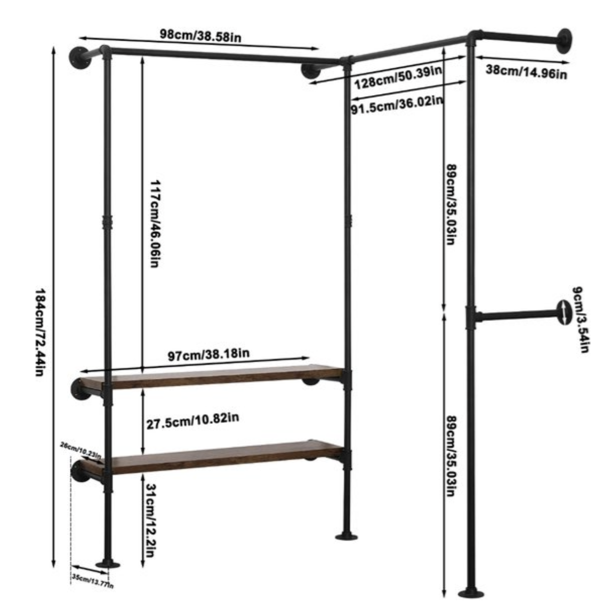 Kledingrek - Garderoberek - Rek - Kleding - Open kledingrek - Wandrek - Kledingkast - Wand gemonteerd - Planken - Stang - Hout - Metaal